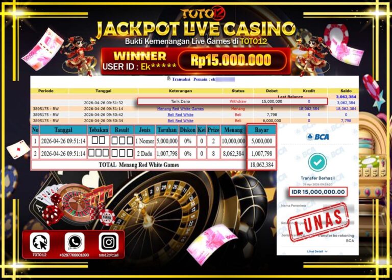 Selamat kepada Member Kami Ek**** Telah Jackpot dan berhasil mendapatkan kemenangan besar pada permainan JACKPOT LIVE GAME CASINO (RED WHITE) Dengan Kemenangan Sebesar Rp.15.000.000–. Setelah mengisi Fomulir Withdraw dengan Kurang waktu 1-2 Menit Dana sudah kami Trasnfer kepada Pemilik Userid dan dana sudah dapat di cairkan oleh pemenang. Bukti Pembayaran yang TOTO12 berikan merupakan Bukti Pembayaran…