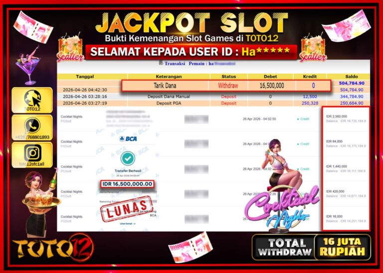 Selamat kepada Member Kami Ha***** Telah Jackpot dan berhasil mendapatkan kemenangan besar pada permainan JACKPOT SLOT GAME (COCKTAIL NIGHTS) Dengan Kemenangan Sebesar Rp.16.500.000–. Setelah mengisi Fomulir Withdraw dengan Kurang waktu 1-2 Menit Dana sudah kami Trasnfer kepada Pemilik Userid dan dana sudah dapat di cairkan oleh pemenang. Bukti Pembayaran yang TOTO12 berikan merupakan Bukti Pembayaran yang SAH…