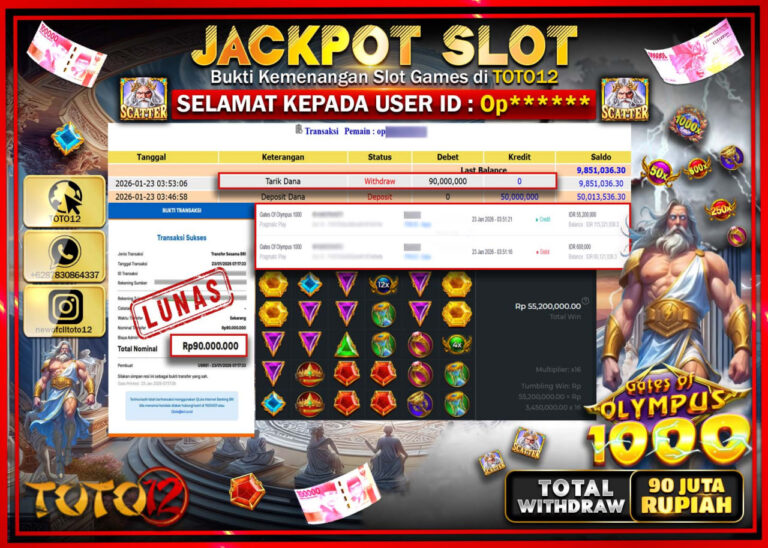 Selamat kepada Member Kami Op****** Telah Jackpot dan berhasil mendapatkan kemenangan besar pada permainan JACKPOT SLOT GAME (GATES OF OLYMPUS 1000) Dengan Kemenangan Sebesar Rp.90.000.000 –. Setelah mengisi Fomulir Withdraw dengan Kurang waktu 1-2 Menit Dana sudah kami Trasnfer kepada Pemilik Userid dan dana sudah dapat di cairkan oleh pemenang. Bukti Pembayaran yang TOTO12 berikan merupakan…