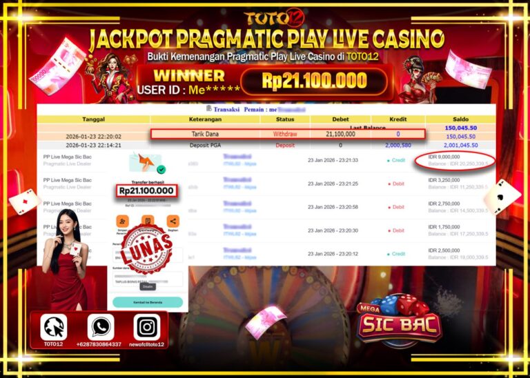 Selamat kepada Member Kami Me****** Telah Jackpot dan berhasil mendapatkan kemenangan besar pada permainan JACKPOT PRAGMATIC PLAY LIVE CASINO (MEGA SIC BAC) Dengan Kemenangan Sebesar Rp.21.100.000 –. Setelah mengisi Fomulir Withdraw dengan Kurang waktu 1-2 Menit Dana sudah kami Trasnfer kepada Pemilik Userid dan dana sudah dapat di cairkan oleh pemenang. Bukti Pembayaran yang TOTO12 berikan…