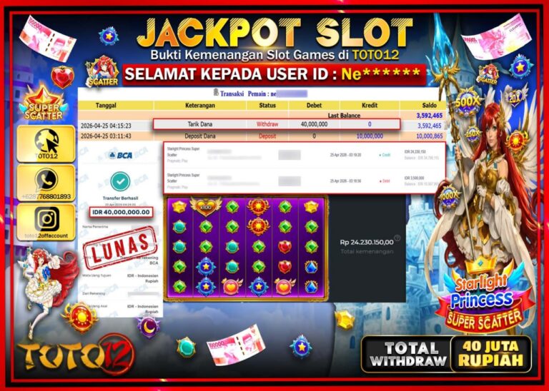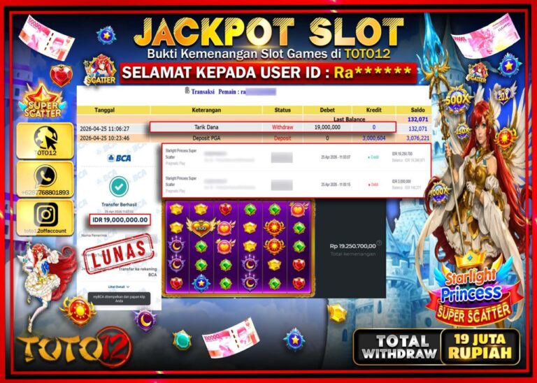 Selamat kepada Member Kami Ra***** Telah Jackpot dan berhasil mendapatkan kemenangan besar pada permainan JACKPOT SLOT GAME (STARLIGHT PRINCESS SUPER SCATTER) Dengan Kemenangan Sebesar Rp.19.000.000–. Setelah mengisi Fomulir Withdraw dengan Kurang waktu 1-2 Menit Dana sudah kami Trasnfer kepada Pemilik Userid dan dana sudah dapat di cairkan oleh pemenang. Bukti Pembayaran yang TOTO12 berikan merupakan Bukti…