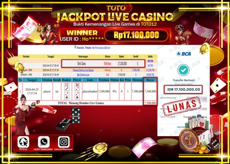 Selamat kepada Member Kami Ho**** Telah Jackpot dan berhasil mendapatkan kemenangan besar pada permainan JACKPOT LIVE GAME CASINO (DOMINO) Dengan Kemenangan Sebesar Rp.17.100.000–. Setelah mengisi Fomulir Withdraw dengan Kurang waktu 1-2 Menit Dana sudah kami Trasnfer kepada Pemilik Userid dan dana sudah dapat di cairkan oleh pemenang. Bukti Pembayaran yang TOTO12 berikan merupakan Bukti Pembayaran yang …