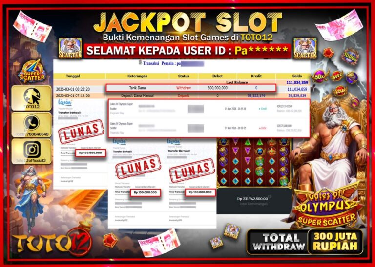 Selamat kepada Member Kami Pa**** Telah Jackpot dan berhasil mendapatkan kemenangan besar pada permainan JACKPOT SLOT GAME (GATES OF OLYMPUS SUPER SCATTER) Dengan Kemenangan Sebesar Rp.300.000.000–. Setelah mengisi Fomulir Withdraw dengan Kurang waktu 1-2 Menit Dana sudah kami Trasnfer kepada Pemilik Userid dan dana sudah dapat di cairkan oleh pemenang. Bukti Pembayaran yang TOTO12 berikan merupakan…