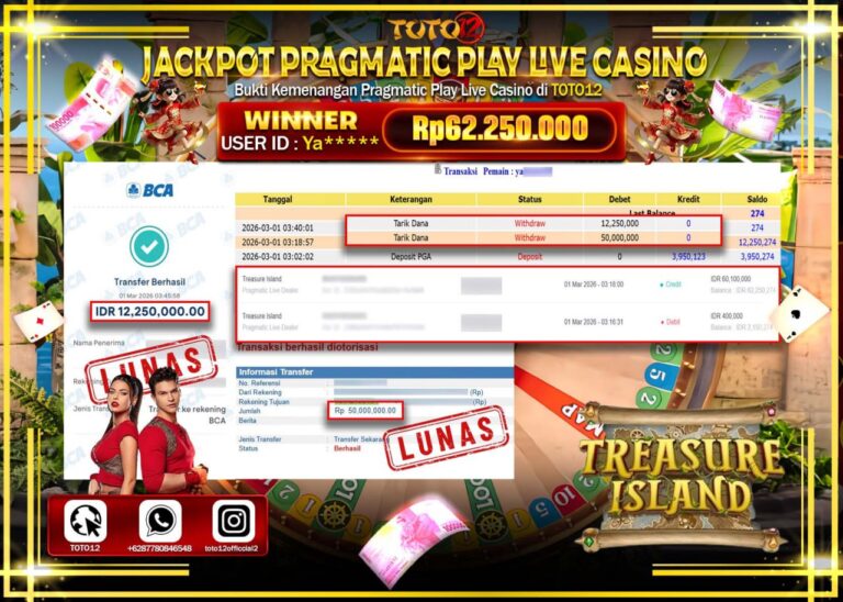 Selamat kepada Member Kami Ya****** Telah Jackpot dan berhasil mendapatkan kemenangan besar pada permainan JACKPOT PRAGMATIC PLAY LIVE GAME CASINO (TREASURE ISLAND) Dengan Kemenangan Sebesar Rp.62.250.000–. Setelah mengisi Fomulir Withdraw dengan Kurang waktu 1-2 Menit Dana sudah kami Trasnfer kepada Pemilik Userid dan dana sudah dapat di cairkan oleh pemenang. Bukti Pembayaran yang TOTO12 berikan merupakan…