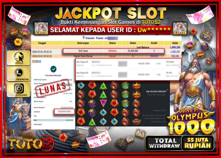 Selamat kepada Member Kami Uw**** Telah Jackpot dan berhasil mendapatkan kemenangan besar pada permainan JACKPOT SLOT GAME (GATES OF OLYMPUS 1000) Dengan Kemenangan Sebesar Rp.55.600.000–. Setelah mengisi Fomulir Withdraw dengan Kurang waktu 1-2 Menit Dana sudah kami Trasnfer kepada Pemilik Userid dan dana sudah dapat di cairkan oleh pemenang. Bukti Pembayaran yang TOTO12 berikan merupakan Bukti…
