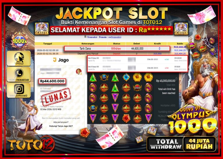 Selamat kepada Member Kami Ra**** Telah Jackpot dan berhasil mendapatkan kemenangan besar pada permainan JACKPOT SLOT GAME (GATES OF OLYMPUS 1000) Dengan Kemenangan Sebesar Rp.44.600.000–. Setelah mengisi Fomulir Withdraw dengan Kurang waktu 1-2 Menit Dana sudah kami Trasnfer kepada Pemilik Userid dan dana sudah dapat di cairkan oleh pemenang. Bukti Pembayaran yang TOTO12 berikan merupakan Bukti…