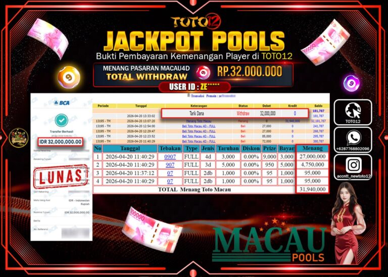 Selamat kepada Member Kami Ze****** Telah Jackpot dan berhasil mendapatkan kemenangan besar pada permainan JACKPOT POOLS PASARAN (MACAU 4D) Dengan Kemenangan Sebesar Rp.32.000.000–. Setelah mengisi Fomulir Withdraw dengan Kurang waktu 1-2 Menit Dana sudah kami Trasnfer kepada Pemilik Userid dan dana sudah dapat di cairkan oleh pemenang. Bukti Pembayaran yang TOTO12 berikan merupakan Bukti Pembayaran yang SAH…