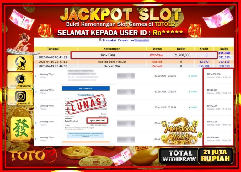Selamat kepada Member Kami Ro***** Telah Jackpot dan berhasil mendapatkan kemenangan besar pada permainan JACKPOT SLOT GAME (MAHJONG WAYS) Dengan Kemenangan Sebesar Rp.21.700.000–. Setelah mengisi Fomulir Withdraw dengan Kurang waktu 1-2 Menit Dana sudah kami Trasnfer kepada Pemilik Userid dan dana sudah dapat di cairkan oleh pemenang. Bukti Pembayaran yang TOTO12 berikan merupakan Bukti Pembayaran yang SAH…