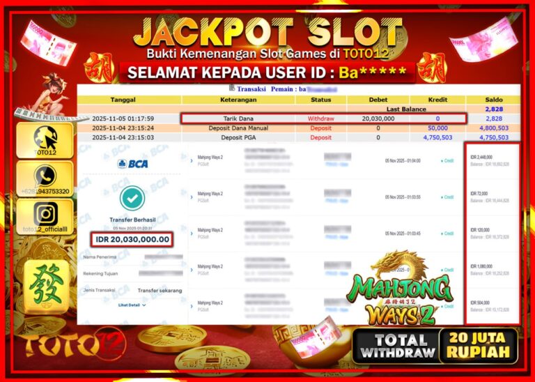 Selamat kepada Member Kami Jo****** Telah Jackpot dan berhasil mendapatkan kemenangan besar pada permainan JACKPOT SLOT GAME (MAHJONG WAYS) Dengan Kemenangan Sebesar Rp.20.000.000 –. Setelah mengisi Fomulir Withdraw dengan Kurang waktu 1-2 Menit Dana sudah kami Trasnfer kepada Pemilik Userid dan dana sudah dapat di cairkan oleh pemenang. Bukti Pembayaran yang TOTO12 berikan merupakan Bukti Pembayaran…
