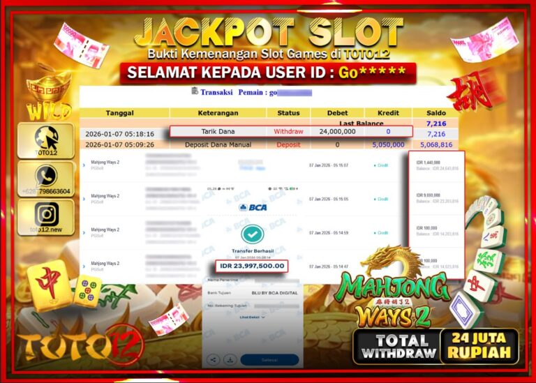 Selamat kepada Member Kami Go****** Telah Jackpot dan berhasil mendapatkan kemenangan besar pada permainan JACKPOT SLOT GAME (MAHJONG WAYS 2) Dengan Kemenangan Sebesar Rp.24.000.000 –. Setelah mengisi Fomulir Withdraw dengan Kurang waktu 1-2 Menit Dana sudah kami Trasnfer kepada Pemilik Userid dan dana sudah dapat di cairkan oleh pemenang. Bukti Pembayaran yang TOTO12 berikan merupakan Bukti…
