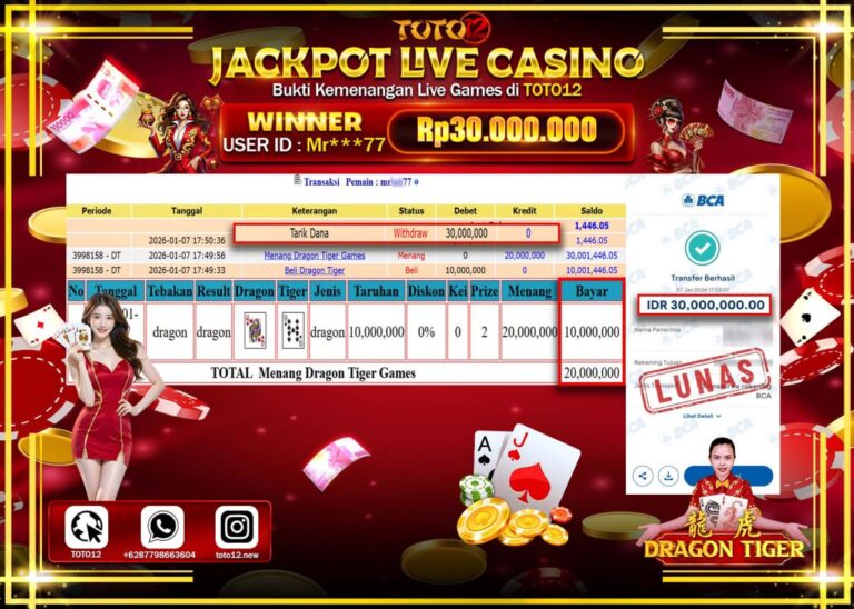 Selamat kepada Member Kami Mr****** Telah Jackpot dan berhasil mendapatkan kemenangan besar pada permainan JACKPOT LIVE CASINO (DRAGON TIGER) Dengan Kemenangan Sebesar Rp.30.000.000 –. Setelah mengisi Fomulir Withdraw dengan Kurang waktu 1-2 Menit Dana sudah kami Trasnfer kepada Pemilik Userid dan dana sudah dapat di cairkan oleh pemenang. Bukti Pembayaran yang TOTO12 berikan merupakan Bukti Pembayaran…