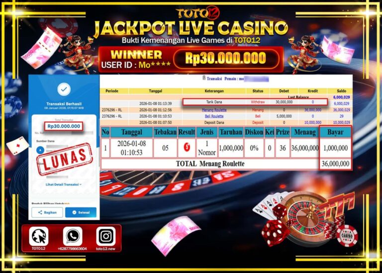 Selamat kepada Member Kami Mo****** Telah Jackpot dan berhasil mendapatkan kemenangan besar pada permainan JACKPOT LIVE CASINO (ROULETTE) Dengan Kemenangan Sebesar Rp.30.000.000 –. Setelah mengisi Fomulir Withdraw dengan Kurang waktu 1-2 Menit Dana sudah kami Trasnfer kepada Pemilik Userid dan dana sudah dapat di cairkan oleh pemenang. Bukti Pembayaran yang TOTO12 berikan merupakan Bukti Pembayaran yang SAH…