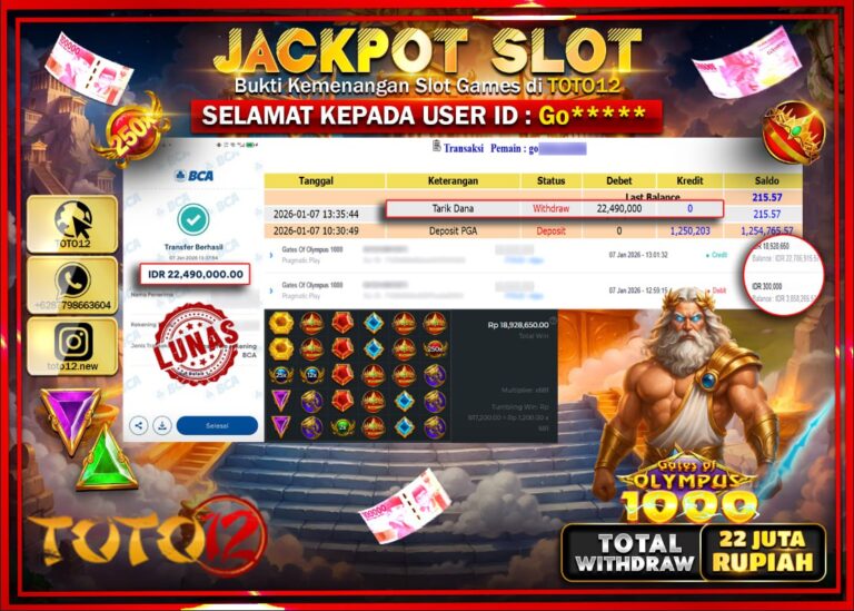 Selamat kepada Member Kami Go****** Telah Jackpot dan berhasil mendapatkan kemenangan besar pada permainan JACKPOT SLOT GAME (GATES OF OLYMPUS 1000) Dengan Kemenangan Sebesar Rp.22.490.000 –. Setelah mengisi Fomulir Withdraw dengan Kurang waktu 1-2 Menit Dana sudah kami Trasnfer kepada Pemilik Userid dan dana sudah dapat di cairkan oleh pemenang. Bukti Pembayaran yang TOTO12 berikan merupakan…