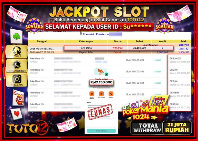 Selamat kepada Member Kami Su****** Telah Jackpot dan berhasil mendapatkan kemenangan besar pada permainan JACKPOT SLOT GAME (POKER MANIA 1024) Dengan Kemenangan Sebesar Rp.21.150.000 –. Setelah mengisi Fomulir Withdraw dengan Kurang waktu 1-2 Menit Dana sudah kami Trasnfer kepada Pemilik Userid dan dana sudah dapat di cairkan oleh pemenang. Bukti Pembayaran yang TOTO12 berikan merupakan Bukti…