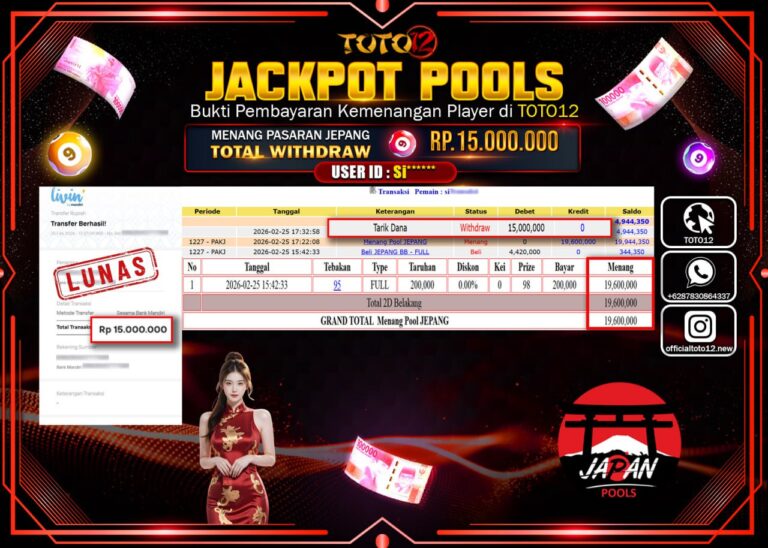 Selamat kepada Member Kami Si****** Telah Jackpot dan berhasil mendapatkan kemenangan besar pada permainan JACKPOT POOLS PASARAN (JEPANG) Dengan Kemenangan Sebesar Rp.15.000.000–. Setelah mengisi Fomulir Withdraw dengan Kurang waktu 1-2 Menit Dana sudah kami Trasnfer kepada Pemilik Userid dan dana sudah dapat di cairkan oleh pemenang. Bukti Pembayaran yang TOTO12 berikan merupakan Bukti Pembayaran yang SAH /…