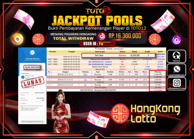 Selamat kepada Member Kami Yu****** Telah Jackpot dan berhasil mendapatkan kemenangan besar pada permainan JACKPOT POOLS PASARAN (HONGKONG) Dengan Kemenangan Sebesar Rp.16.300.000–. Setelah mengisi Fomulir Withdraw dengan Kurang waktu 1-2 Menit Dana sudah kami Trasnfer kepada Pemilik Userid dan dana sudah dapat di cairkan oleh pemenang. Bukti Pembayaran yang TOTO12 berikan merupakan Bukti Pembayaran yang SAH /…