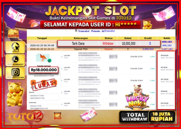 Selamat kepada Member Kami Hi***** Telah Jackpot dan berhasil mendapatkan kemenangan besar pada permainan JACKPOT SLOT GAME (LUCKY NEKO) Dengan Kemenangan Sebesar Rp.18.000.000–. Setelah mengisi Fomulir Withdraw dengan Kurang waktu 1-2 Menit Dana sudah kami Trasnfer kepada Pemilik Userid dan dana sudah dapat di cairkan oleh pemenang. Bukti Pembayaran yang TOTO12 berikan merupakan Bukti Pembayaran yang SAH…