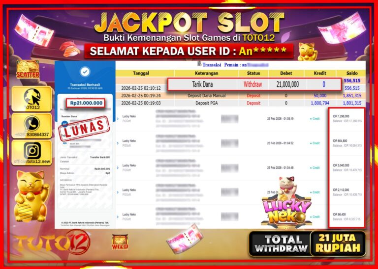 Selamat kepada Member Kami An***** Telah Jackpot dan berhasil mendapatkan kemenangan besar pada permainan JACKPOT SLOT GAME (LUCK NEKO) Dengan Kemenangan Sebesar Rp.21.000.000–. Setelah mengisi Fomulir Withdraw dengan Kurang waktu 1-2 Menit Dana sudah kami Trasnfer kepada Pemilik Userid dan dana sudah dapat di cairkan oleh pemenang. Bukti Pembayaran yang TOTO12 berikan merupakan Bukti Pembayaran yang SAH…