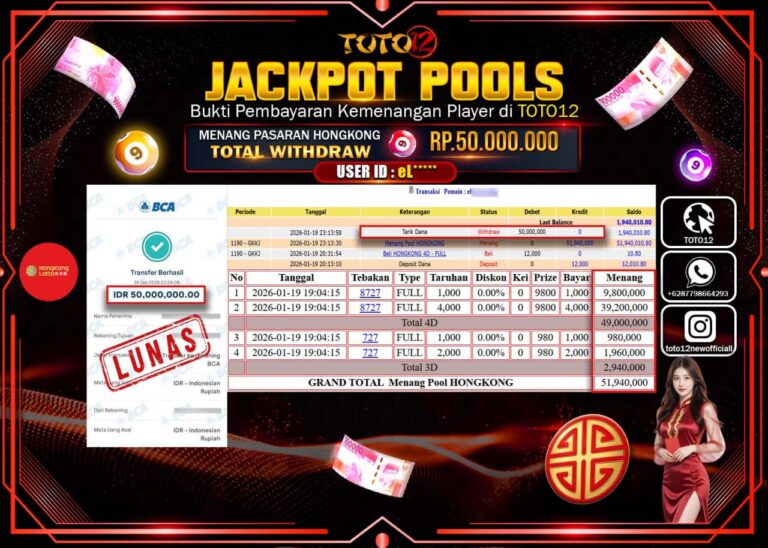 Selamat kepada Member Kami Ka****** Telah Jackpot dan berhasil mendapatkan kemenangan besar pada permainan JACKPOT POOLS PASARAN (MACAU 4D) Dengan Kemenangan Sebesar Rp.48.000.000 –. Setelah mengisi Fomulir Withdraw dengan Kurang waktu 1-2 Menit Dana sudah kami Trasnfer kepada Pemilik Userid dan dana sudah dapat di cairkan oleh pemenang. Bukti Pembayaran yang TOTO12 berikan merupakan Bukti Pembayaran…