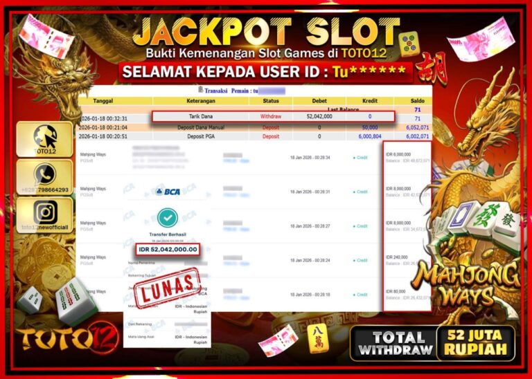 Selamat kepada Member Kami Tu****** Telah Jackpot dan berhasil mendapatkan kemenangan besar pada permainan JACKPOT SLOT GAME (MAHJONG WAYS) Dengan Kemenangan Sebesar Rp.52.042.000 –. Setelah mengisi Fomulir Withdraw dengan Kurang waktu 1-2 Menit Dana sudah kami Trasnfer kepada Pemilik Userid dan dana sudah dapat di cairkan oleh pemenang. Bukti Pembayaran yang TOTO12 berikan merupakan Bukti Pembayaran…