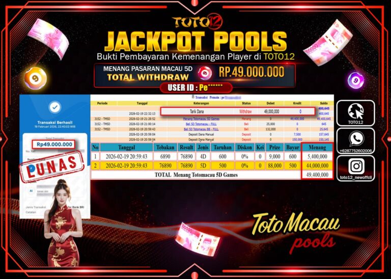 Selamat kepada Member Kami Pe****** Telah Jackpot dan berhasil mendapatkan kemenangan besar pada permainan JACKPOT POOLS PASARAN (TOTOMACAU 5D Dengan Kemenangan Sebesar Rp.47.000.000–. Setelah mengisi Fomulir Withdraw dengan Kurang waktu 1-2 Menit Dana sudah kami Trasnfer kepada Pemilik Userid dan dana sudah dapat di cairkan oleh pemenang. Bukti Pembayaran yang TOTO12 berikan merupakan Bukti Pembayaran yang SAH…