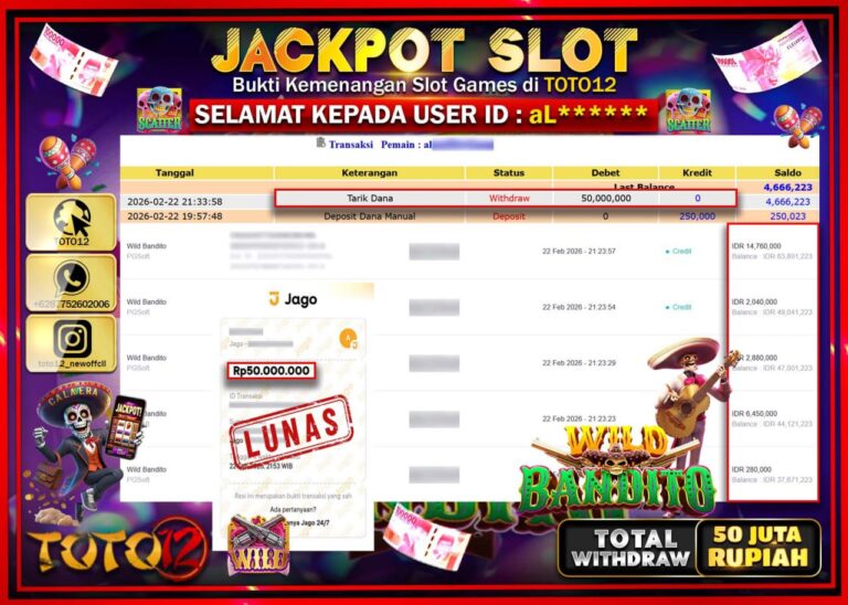 Selamat kepada Member Kami aL***** Telah Jackpot dan berhasil mendapatkan kemenangan besar pada permainan JACKPOT SLOT GAME (WILD BANDITO) Dengan Kemenangan Sebesar Rp.50.000.000–. Setelah mengisi Fomulir Withdraw dengan Kurang waktu 1-2 Menit Dana sudah kami Trasnfer kepada Pemilik Userid dan dana sudah dapat di cairkan oleh pemenang. Bukti Pembayaran yang TOTO12 berikan merupakan Bukti Pembayaran yang SAH…
