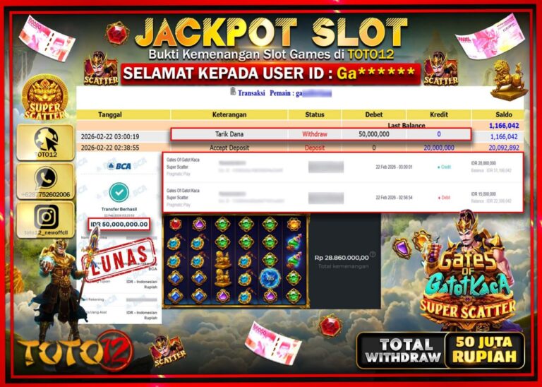 Selamat kepada Member Kami Ga***** Telah Jackpot dan berhasil mendapatkan kemenangan besar pada permainan JACKPOT SLOT GAME (GATES OF GATOT KACA SUPER SCATTER) Dengan Kemenangan Sebesar Rp.50.000.000–. Setelah mengisi Fomulir Withdraw dengan Kurang waktu 1-2 Menit Dana sudah kami Trasnfer kepada Pemilik Userid dan dana sudah dapat di cairkan oleh pemenang. Bukti Pembayaran yang TOTO12 berikan…