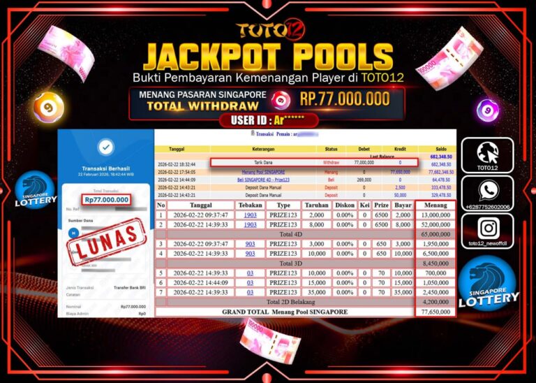 Selamat kepada Member Kami Ar****** Telah Jackpot dan berhasil mendapatkan kemenangan besar pada permainan JACKPOT POOLS PASARAN (SINGAPORE) Dengan Kemenangan Sebesar Rp.77.000.000–. Setelah mengisi Fomulir Withdraw dengan Kurang waktu 1-2 Menit Dana sudah kami Trasnfer kepada Pemilik Userid dan dana sudah dapat di cairkan oleh pemenang. Bukti Pembayaran yang TOTO12 berikan merupakan Bukti Pembayaran yang SAH /…