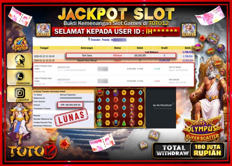 Selamat kepada Member Kami iH***** Telah Jackpot dan berhasil mendapatkan kemenangan besar pada permainan JACKPOT SLOT GAME (GATES OF OLYMPUS SUPER SCATTER) Dengan Kemenangan Sebesar Rp.180.000.000–. Setelah mengisi Fomulir Withdraw dengan Kurang waktu 1-2 Menit Dana sudah kami Trasnfer kepada Pemilik Userid dan dana sudah dapat di cairkan oleh pemenang. Bukti Pembayaran yang TOTO12 berikan merupakan…