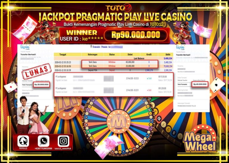 Selamat kepada Member Kami Ke****** Telah Jackpot dan berhasil mendapatkan kemenangan besar pada permainan JACKPOT PRAGMATIC PLAY LIVE GAMES CASINO (PP LIVE MEGA WHEEL) Dengan Kemenangan Sebesar Rp.90.000.000–. Setelah mengisi Fomulir Withdraw dengan Kurang waktu 1-2 Menit Dana sudah kami Trasnfer kepada Pemilik Userid dan dana sudah dapat di cairkan oleh pemenang. Bukti Pembayaran yang TOTO12…