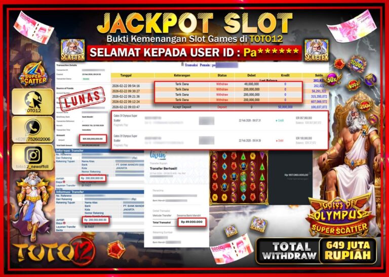 Selamat kepada Member Kami Pa***** Telah Jackpot dan berhasil mendapatkan kemenangan besar pada permainan JACKPOT SLOT GAME (GATES OF OLYMPUS SUPER SCATTER) Dengan Kemenangan Sebesar Rp.649.000.000–. Setelah mengisi Fomulir Withdraw dengan Kurang waktu 1-2 Menit Dana sudah kami Trasnfer kepada Pemilik Userid dan dana sudah dapat di cairkan oleh pemenang. Bukti Pembayaran yang TOTO12 berikan merupakan…