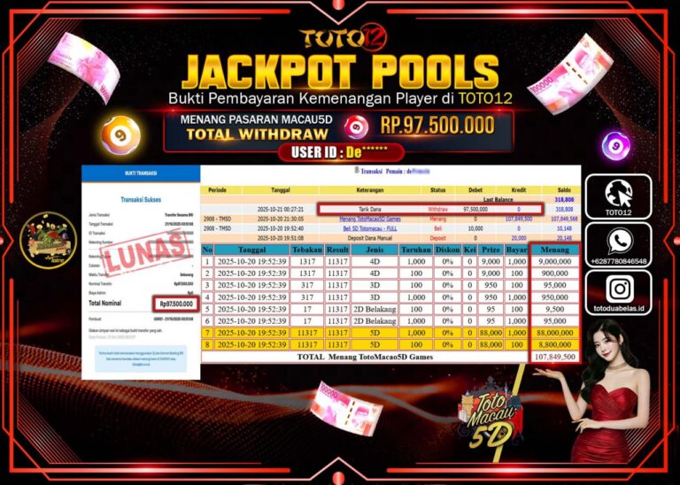 Selamat kepada Member Kami De****** Telah Jackpot dan berhasil mendapatkan kemenangan besar pada permainan JACKPOT POOLS PASARAN (MACAU 5D) Dengan Kemenangan Sebesar Rp.97.500.000 –. Setelah mengisi Fomulir Withdraw dengan Kurang waktu 1-2 Menit Dana sudah kami Trasnfer kepada Pemilik Userid dan dana sudah dapat di cairkan oleh pemenang. Bukti Pembayaran yang TOTO12 berikan merupakan Bukti Pembayaran…