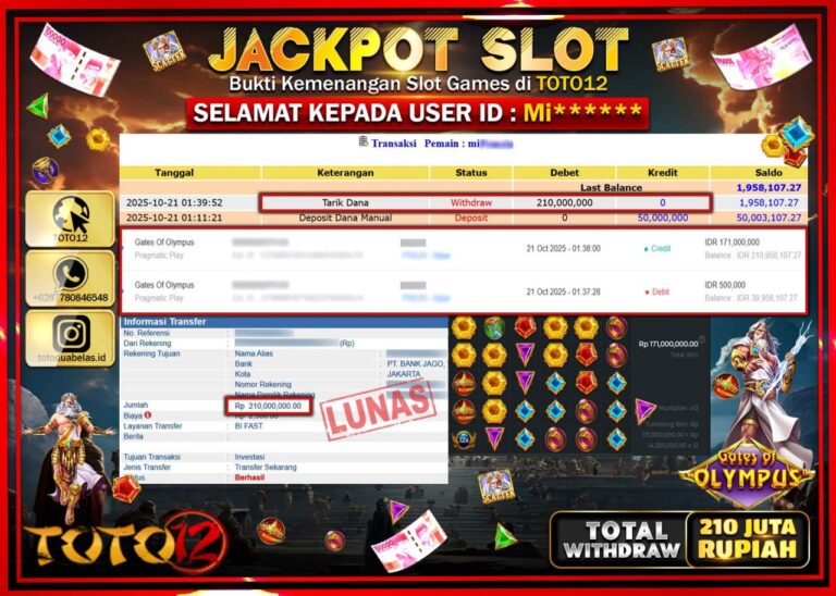 Selamat kepada Member Kami Mi****** Telah Jackpot dan berhasil mendapatkan kemenangan besar pada permainan JACKPOT SLOT GAME (GATES OF OLYMPUS) Dengan Kemenangan Sebesar Rp.210.000.000 –. Setelah mengisi Fomulir Withdraw dengan Kurang waktu 1-2 Menit Dana sudah kami Trasnfer kepada Pemilik Userid dan dana sudah dapat di cairkan oleh pemenang. Bukti Pembayaran yang TOTO12 berikan merupakan Bukti…