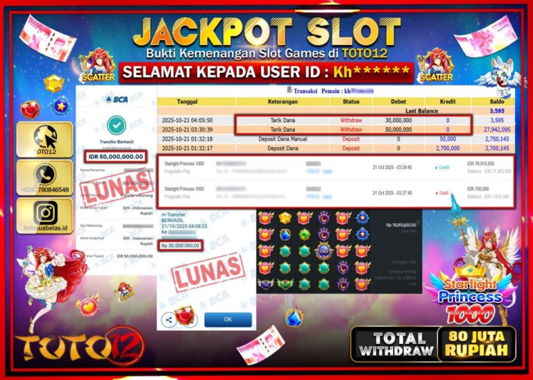 Selamat kepada Member Kami Kh****** Telah Jackpot dan berhasil mendapatkan kemenangan besar pada permainan JACKPOT SLOT GAME (STARLIGHT PRINCESS 1000) Dengan Kemenangan Sebesar Rp.80.000.000 –. Setelah mengisi Fomulir Withdraw dengan Kurang waktu 1-2 Menit Dana sudah kami Trasnfer kepada Pemilik Userid dan dana sudah dapat di cairkan oleh pemenang. Bukti Pembayaran yang TOTO12 berikan merupakan Bukti…