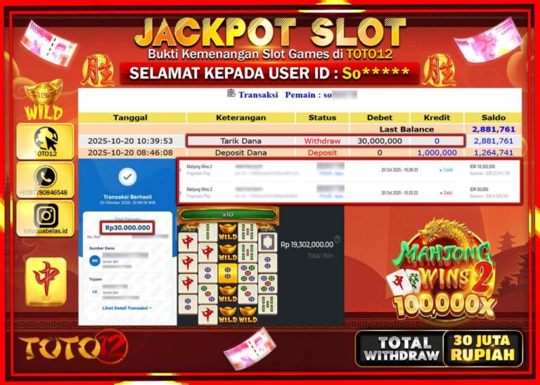 Selamat kepada Member Kami So****** Telah Jackpot dan berhasil mendapatkan kemenangan besar pada permainan JACKPOT SLOT GAME (MAHJONG WINS 2) Dengan Kemenangan Sebesar Rp.30.000.000 –. Setelah mengisi Fomulir Withdraw dengan Kurang waktu 1-2 Menit Dana sudah kami Trasnfer kepada Pemilik Userid dan dana sudah dapat di cairkan oleh pemenang. Bukti Pembayaran yang TOTO12 berikan merupakan Bukti…