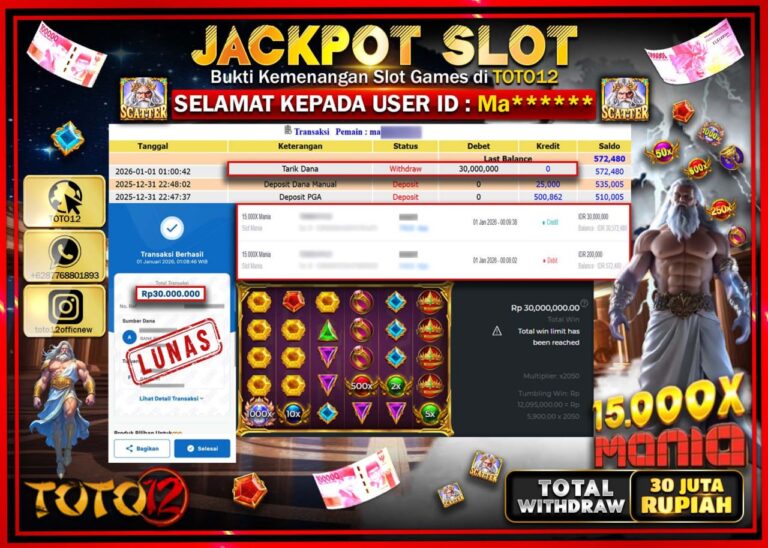 Selamat kepada Member Kami Ma****** Telah Jackpot dan berhasil mendapatkan kemenangan besar pada permainan JACKPOT SLOT GAME (15.000X MANIA) Dengan Kemenangan Sebesar Rp.30.000.000 –. Setelah mengisi Fomulir Withdraw dengan Kurang waktu 1-2 Menit Dana sudah kami Trasnfer kepada Pemilik Userid dan dana sudah dapat di cairkan oleh pemenang. Bukti Pembayaran yang TOTO12 berikan merupakan Bukti Pembayaran…