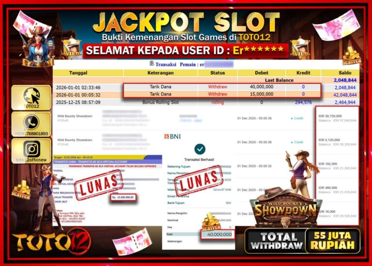 Selamat kepada Member Kami Er****** Telah Jackpot dan berhasil mendapatkan kemenangan besar pada permainan JACKPOT SLOT GAME (WILD BOUNTY SHOWDOWN) Dengan Kemenangan Sebesar Rp.55.000.000 –. Setelah mengisi Fomulir Withdraw dengan Kurang waktu 1-2 Menit Dana sudah kami Trasnfer kepada Pemilik Userid dan dana sudah dapat di cairkan oleh pemenang. Bukti Pembayaran yang TOTO12 berikan merupakan Bukti…