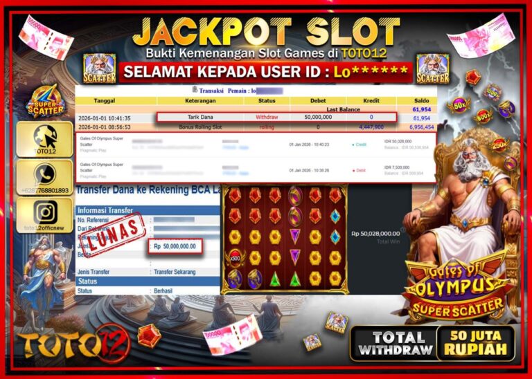 Selamat kepada Member Kami Lo****** Telah Jackpot dan berhasil mendapatkan kemenangan besar pada permainan JACKPOT SLOT GAME (GATES OF OLYMPUS SUPER SCATTER) Dengan Kemenangan Sebesar Rp.50.000.000 –. Setelah mengisi Fomulir Withdraw dengan Kurang waktu 1-2 Menit Dana sudah kami Trasnfer kepada Pemilik Userid dan dana sudah dapat di cairkan oleh pemenang. Bukti Pembayaran yang TOTO12 berikan…