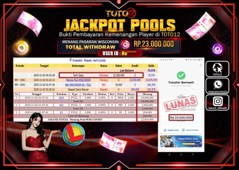 Selamat kepada Member Kami Ha****** Telah Jackpot dan berhasil mendapatkan kemenangan besar pada permainan JACKPOT POOLS PASARAN (WISCONSIN) Dengan Kemenangan Sebesar Rp.23.000.000 –. Setelah mengisi Fomulir Withdraw dengan Kurang waktu 1-2 Menit Dana sudah kami Trasnfer kepada Pemilik Userid dan dana sudah dapat di cairkan oleh pemenang. Bukti Pembayaran yang TOTO12 berikan merupakan Bukti Pembayaran yang …