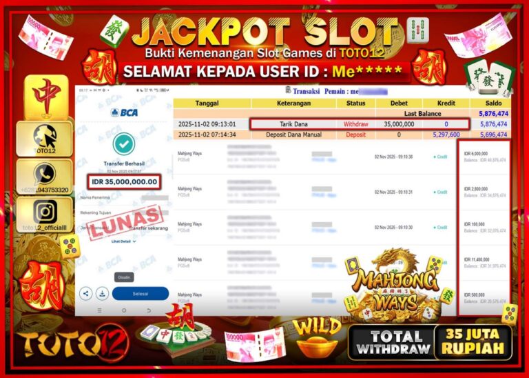 Selamat kepada Member Kami Me****** Telah Jackpot dan berhasil mendapatkan kemenangan besar pada permainan JACKPOT SLOT GAME (MAHJONG WAYS) Dengan Kemenangan Sebesar Rp.35.000.000 –. Setelah mengisi Fomulir Withdraw dengan Kurang waktu 1-2 Menit Dana sudah kami Trasnfer kepada Pemilik Userid dan dana sudah dapat di cairkan oleh pemenang. Bukti Pembayaran yang TOTO12 berikan merupakan Bukti Pembayaran…