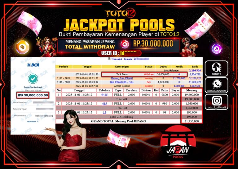 Selamat kepada Member Kami Id****** Telah Jackpot dan berhasil mendapatkan kemenangan besar pada permainan JACKPOT POOLS PASARAN (JEPANG) Dengan Kemenangan Sebesar Rp.30.000.000 –. Setelah mengisi Fomulir Withdraw dengan Kurang waktu 1-2 Menit Dana sudah kami Trasnfer kepada Pemilik Userid dan dana sudah dapat di cairkan oleh pemenang. Bukti Pembayaran yang TOTO12 berikan merupakan Bukti Pembayaran yang …