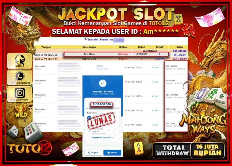 Selamat kepada Member Kami Am****** Telah Jackpot dan berhasil mendapatkan kemenangan besar pada permainan JACKPOT SLOT GAME (MAHJONG WAYS) Dengan Kemenangan Sebesar Rp.16.000.000 –. Setelah mengisi Fomulir Withdraw dengan Kurang waktu 1-2 Menit Dana sudah kami Trasnfer kepada Pemilik Userid dan dana sudah dapat di cairkan oleh pemenang. Bukti Pembayaran yang TOTO12 berikan merupakan Bukti Pembayaran…