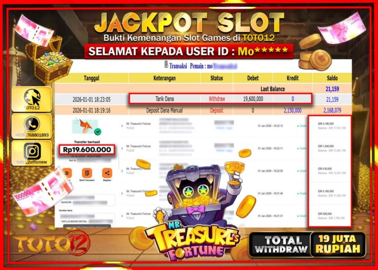 Selamat kepada Member Kami Mo****** Telah Jackpot dan berhasil mendapatkan kemenangan besar pada permainan JACKPOT SLOT GAME (MR TREASURE FORTUNE) Dengan Kemenangan Sebesar Rp.19.600.000 –. Setelah mengisi Fomulir Withdraw dengan Kurang waktu 1-2 Menit Dana sudah kami Trasnfer kepada Pemilik Userid dan dana sudah dapat di cairkan oleh pemenang. Bukti Pembayaran yang TOTO12 berikan merupakan Bukti…