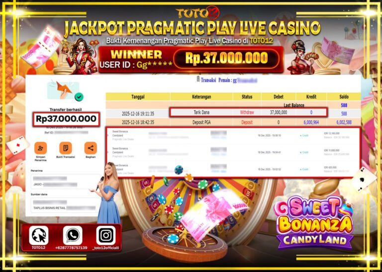 Selamat kepada Member Kami Gg****** Telah Jackpot dan berhasil mendapatkan kemenangan besar pada permainan JACKPOT PRAGMATIC PLAY LIVE CASINO (SWEET BONANZA CANDY LAND) Dengan Kemenangan Sebesar Rp.37.000.000 –. Setelah mengisi Fomulir Withdraw dengan Kurang waktu 1-2 Menit Dana sudah kami Trasnfer kepada Pemilik Userid dan dana sudah dapat di cairkan oleh pemenang. Bukti Pembayaran yang TOTO12…