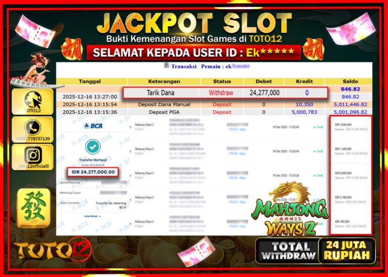 Selamat kepada Member Kami Ek****** Telah Jackpot dan berhasil mendapatkan kemenangan besar pada permainan JACKPOT SLOT GAME (MAHJONG WAYS 2) Dengan Kemenangan Sebesar Rp.24.277.000 –. Setelah mengisi Fomulir Withdraw dengan Kurang waktu 1-2 Menit Dana sudah kami Trasnfer kepada Pemilik Userid dan dana sudah dapat di cairkan oleh pemenang. Bukti Pembayaran yang TOTO12 berikan merupakan Bukti…