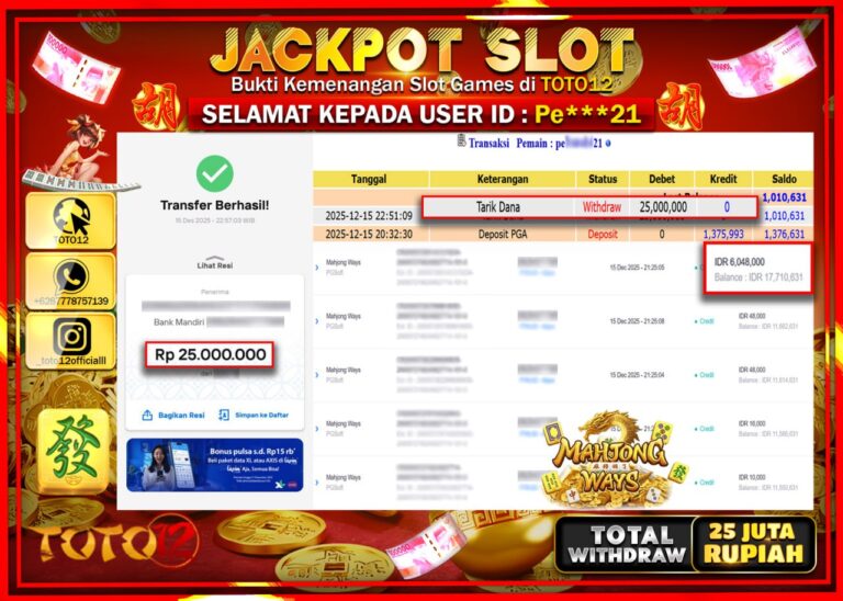 Selamat kepada Member Kami Pe****21Telah Jackpot dan berhasil mendapatkan kemenangan besar pada permainan JACKPOT SLOT GAME (MAHJONG WAYS) Dengan Kemenangan Sebesar Rp.25.000.000 –. Setelah mengisi Fomulir Withdraw dengan Kurang waktu 1-2 Menit Dana sudah kami Trasnfer kepada Pemilik Userid dan dana sudah dapat di cairkan oleh pemenang. Bukti Pembayaran yang TOTO12 berikan merupakan Bukti Pembayaran yang SAH…