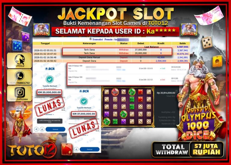 Selamat kepada Member Kami Ka****** Telah Jackpot dan berhasil mendapatkan kemenangan besar pada permainan JACKPOT SLOT GAME (GATES OF OLYMPUS 1000 DICE) Dengan Kemenangan Sebesar Rp.57.000.000 –. Setelah mengisi Fomulir Withdraw dengan Kurang waktu 1-2 Menit Dana sudah kami Trasnfer kepada Pemilik Userid dan dana sudah dapat di cairkan oleh pemenang. Bukti Pembayaran yang TOTO12 berikan…