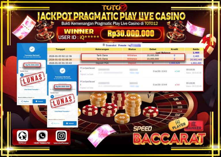 Selamat kepada Member Kami Iq****** Telah Jackpot dan berhasil mendapatkan kemenangan besar pada permainan JACKPOT PRAGMATIC PLAY LIVE CASINO (SPEED BACCARAT) Dengan Kemenangan Sebesar Rp.30.000.000 –. Setelah mengisi Fomulir Withdraw dengan Kurang waktu 1-2 Menit Dana sudah kami Trasnfer kepada Pemilik Userid dan dana sudah dapat di cairkan oleh pemenang. Bukti Pembayaran yang TOTO12 berikan merupakan…