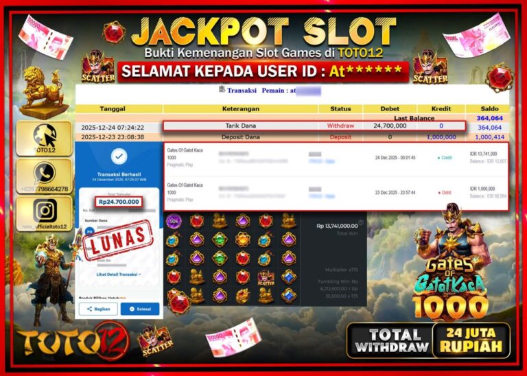 Selamat kepada Member Kami At****** Telah Jackpot dan berhasil mendapatkan kemenangan besar pada permainan JACKPOT SLOT GAME (GATES OF GATOT KACA 1000) Dengan Kemenangan Sebesar Rp.24.700.000 –. Setelah mengisi Fomulir Withdraw dengan Kurang waktu 1-2 Menit Dana sudah kami Trasnfer kepada Pemilik Userid dan dana sudah dapat di cairkan oleh pemenang. Bukti Pembayaran yang TOTO12 berikan…