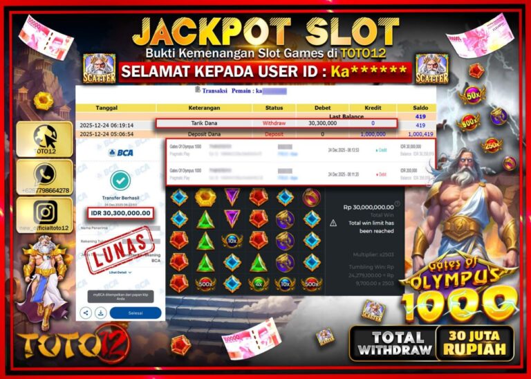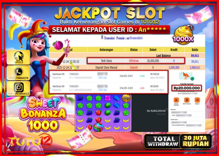 Selamat kepada Member Kami An****** Telah Jackpot dan berhasil mendapatkan kemenangan besar pada permainan JACKPOT SLOT GAME (SWEET BONANZA 1000) Dengan Kemenangan Sebesar Rp.20.000.000 –. Setelah mengisi Fomulir Withdraw dengan Kurang waktu 1-2 Menit Dana sudah kami Trasnfer kepada Pemilik Userid dan dana sudah dapat di cairkan oleh pemenang. Bukti Pembayaran yang TOTO12 berikan merupakan Bukti…